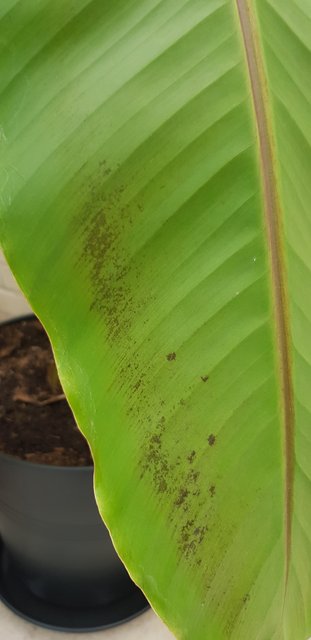 Soil mix is standard compost non dense mix for potting plants. Free Draining. Recently upgraded from a 9 Litre to a 29 Litre/7.25 Gallon pot. I want to keep in a pot in case I have to move out. Growing in a conservatory, with some sunlight and shade. Never been in full sunlight. I have been occasionally feeding a synthetic fast acting fertilizer for banana plants. The black marks are on old and newish leaves. Latest leaves do not have these marks but I expect that to change. Currently on 90% of the leaves. There is a lot of Guttation from the plant which tells me I am overwatering it. Back in July in 9 Litre pot: ![]() |