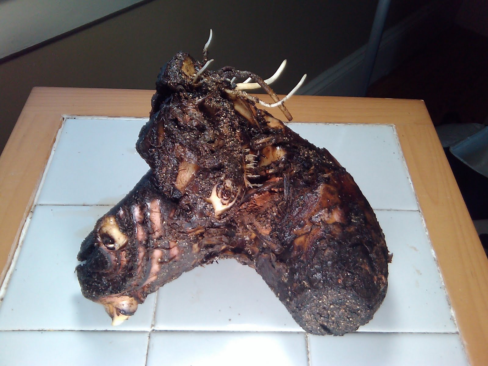 I salvaged a fairly large corm from a neighbor's lawn waste pile--about two thirds the size of a football. The original grow point of the corm was damaged, but the corm did produce two new banana plants. These plants have grown 4 feet in two months indoors. I know that banana plants must produce 50 to 80 leaves before they flower. Well suppose my mystery corm has already produced 30 leaves since it is fairly large, and suppose that my mystery banana must make 80 leaves before it flowers. Would one of my sprouts be considered a continuance of the previously grown plant and thus would only need to produce 50 more leaves to flower? Or is my leaf count reset to zero, and I therefore must wait for 80 leaves to grow before it flowers? The pictures are of the mystery corm and the resulting mystery plants.