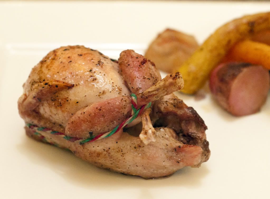 Last meal of 2012, roasted quail and root veggies.